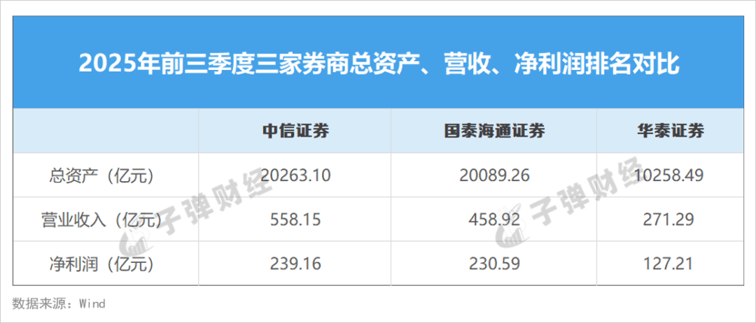 而华泰证券总资产规模从业内第二位滑落至第三位。虽然排名依然靠前,但财报数据显示,华泰证券总资产规模在2025年三季度突破万亿大关,至1.03万亿元。