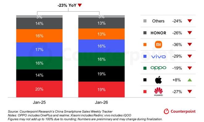 前不久,机构Counterpoint Research发布了中国智能手机周度销量追踪报告,数据不太好看。今年1月,中国智能手机销量同比下降23%,大多数国产品牌都遭遇了两位数的下滑幅度,只有苹果保持了同比正增长。