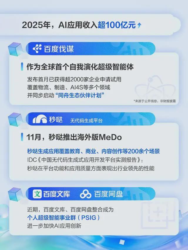 最后是 AI 应用全年收入突破 100 亿元,无代码平台 “秒哒” 被 IDC 认证为行业领先,超级智能体 “伐谋” 吸引超 2000 家企业试用。