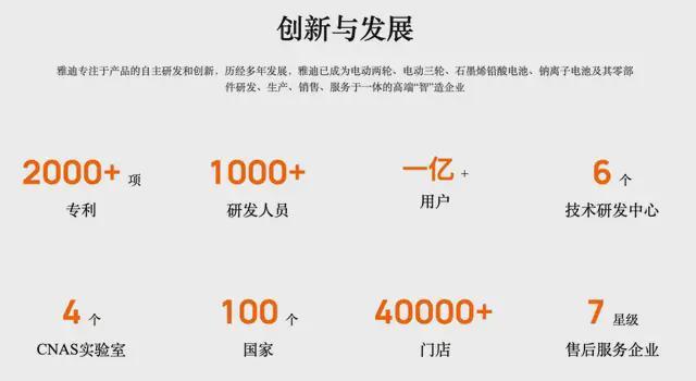 自 2016 年上市至 2025 年,雅迪累计研发投入超 60 亿元,手握超 2000 项专利,建成 4 个 CNAS 国家型企业实验室。