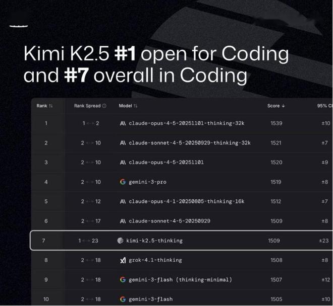 这个被杨植麟称为“目前最智能的模型”,拿到LMAren榜单上的全球开源模型代码能力、视觉能力第一;视觉能力上仅次于Gemini和GPT系列模型;代码能力仅次于Claude和Gemini。