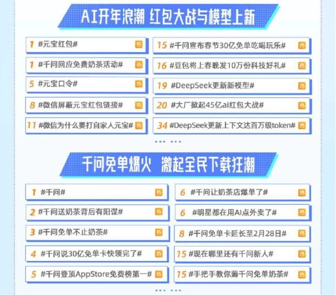 在全民热衷的“红包大战”中,腾讯元宝推出的#元宝微信发红包#话题,以无门槛提现、AI深度互动等要素,借助微博话题裂变,快速渗透大众圈层,吸引海量用户参与;阿里巴巴旗下千问则借助#千问宣布春节30亿免单吃喝玩乐#话题热搜强势出圈,仅活动上线9小时便送出超1000万杯奶茶,实现AI与日常生活消费深度绑定。