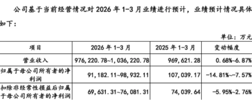 基于当前经营情况,公司预计2026年1-3月实现营业收入为97.62亿元-103.62亿元,同比变动率为0.68%-6.87%;预计归属于母公司所有者的净利润为9.12亿元-9.89亿元,同比变动率为-14.81%--7.57%;预计扣除非经常性损益后归属于母公司所有者的净利润为6.96亿元-7.61亿元,同比变动率为-5.95%--2.76%。其中归母净利润及扣非后归母净利润均出现负增长,业绩承压。