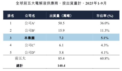 不过,昆仑新能源所处的电解液行业竞争激烈且高度集中。根据弗若斯特沙利文的资料,按出货量计,于截至2025年9月30日止九个月,前五名电解液供应商的合计市占率为60.8%,市场份额相对集中,其中公司2025年前三季度电解液出货量达到7.2万吨,排名上升至第三,市占率增长至5.1%。第一为公司A,市占率为36.0%,第二为公司B,市占率为11.3%。昆仑新能源要想赶超对手压力不小。