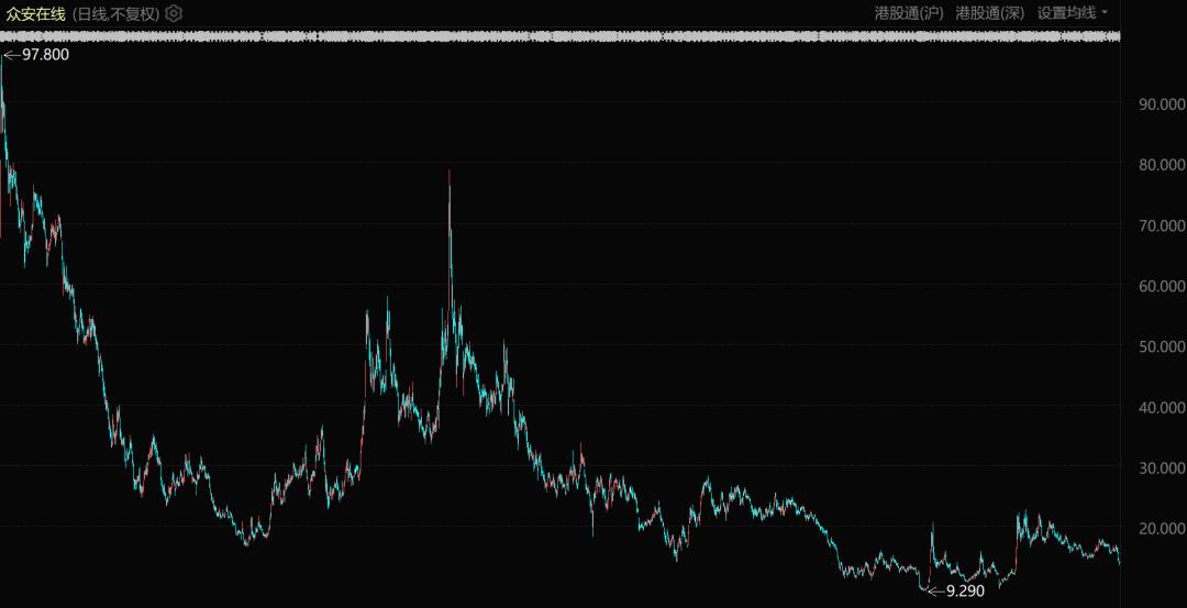 赛道的标志性股票众安在线也是深刻演绎了什么叫出道即巅峰,股价一路下跌,如今已不足发行价的四分之一。