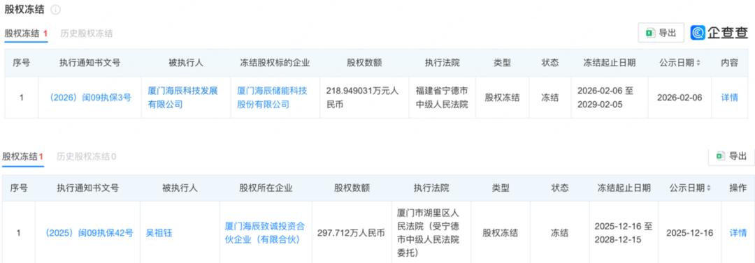 更复杂的是,这并非海辰储能面临的唯一的法律纠纷。过去一年,公司已经与行业龙头宁德时代多次陷入专利与不正当竞争纠纷,目前,海辰储能部分公司股权及创始人吴祖钰相关持股平台的部分股权已被司法冻结。
