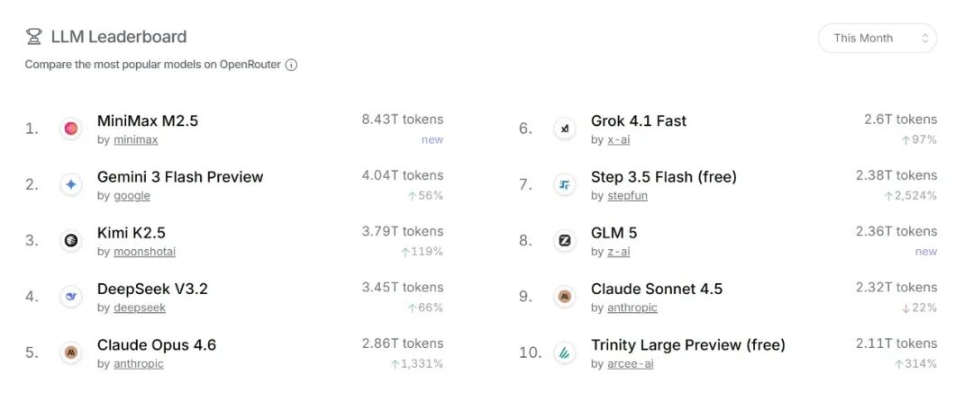 OpenRouter最新公开榜单上,Step 3.5 Flash、Gemini 3 Flash Preview、DeepSeek V3.2、Claude Opus 4.6都在拼命追赶。