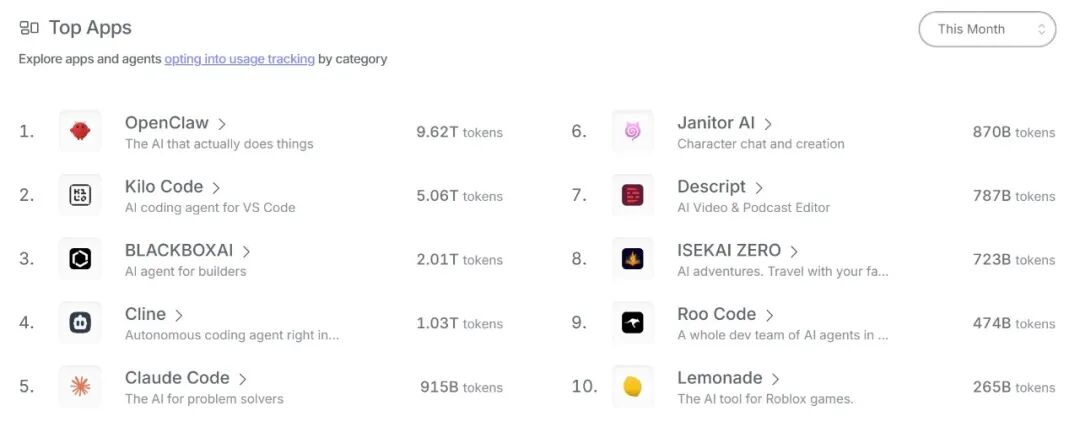 最近一个月,排在最前面的就是OpenClaw,累计消耗9.62T tokens;紧接着是Kilo Code的5.06T tokens、BLACKBOXAI的2.01T tokens,清一色都是Agent(智能体)产品。