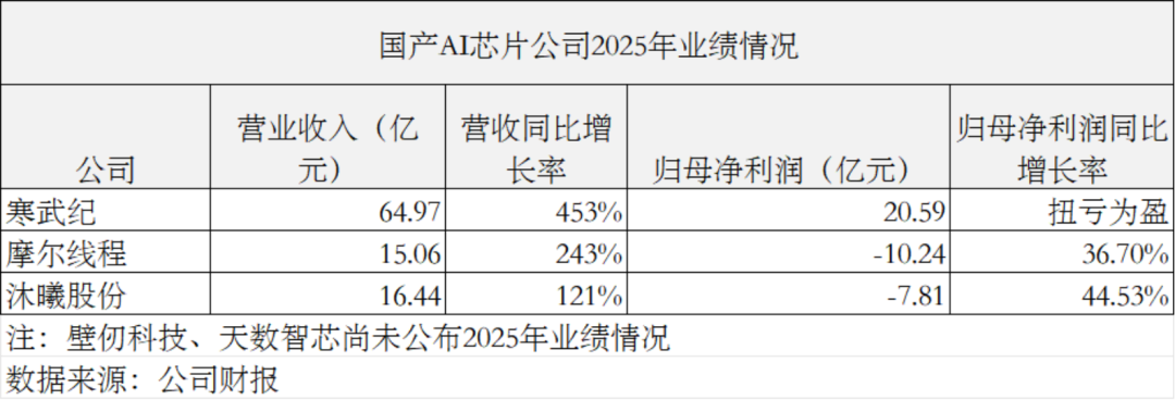 从目前已发布的寒武纪、摩尔线程与沐曦股份2025年业绩情况来看,三家国产AI芯片公司2025年业绩均呈现营收大幅增长,同时净利润实现扭亏为盈或加速扭亏。