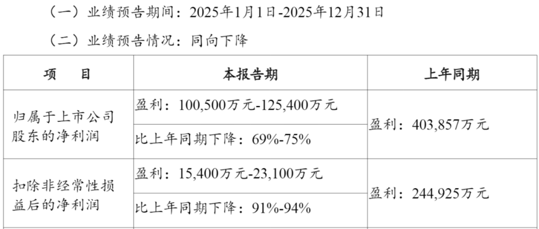 与之形成鲜明对比的是,公司预计利润将大跌。2025年,其预计实现归母净利润10.05亿元-12.54亿元,同比下滑69%-75%;扣除非经常性损益后的净利润(以下简称“扣非净利润”)1.54亿元至2.31亿元,同比骤降91%至94%。