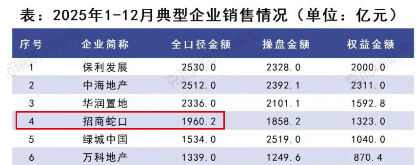 不过,由于2025年万科身处风暴中心,销售额骤降,克而瑞数据显示,招商蛇口在2025年又“捡漏”成为行业第4名。(编者按:以全口径销售额计算)