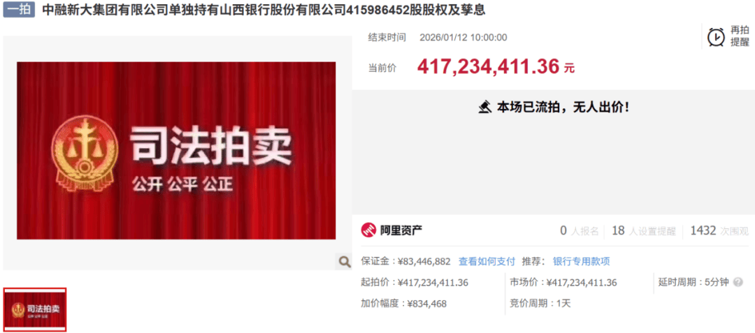 (图 / 山西银行第四大股东中融新大股权流拍(来源:阿里资产拍卖平台))
