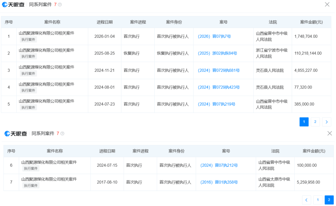 天眼查显示,山西聚源煤化在2017年至2026年初期间,因不同纠纷案件而多次被列为被执行人。