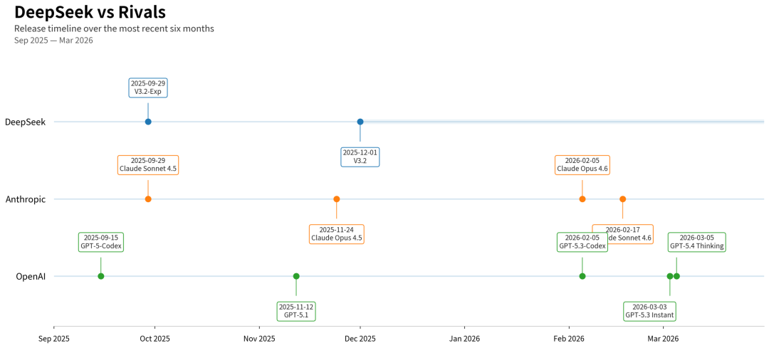 DeepSeek vs 对手发布频率时间轴图(2025.9-2026.3)