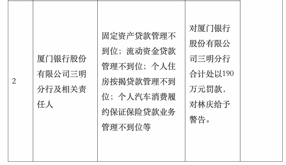 3月16日,国家金融监管总局三明金融监管分局行政处罚信息公示表显示,厦门银行三明分行,因固定资产贷款管理不到位;流动资金贷款管理不到位;个人住房按揭贷款管理不到位;个人汽车消费履约保证保险贷款业务管理不到位等,被罚款190万元。同时,对林庆给予警告。