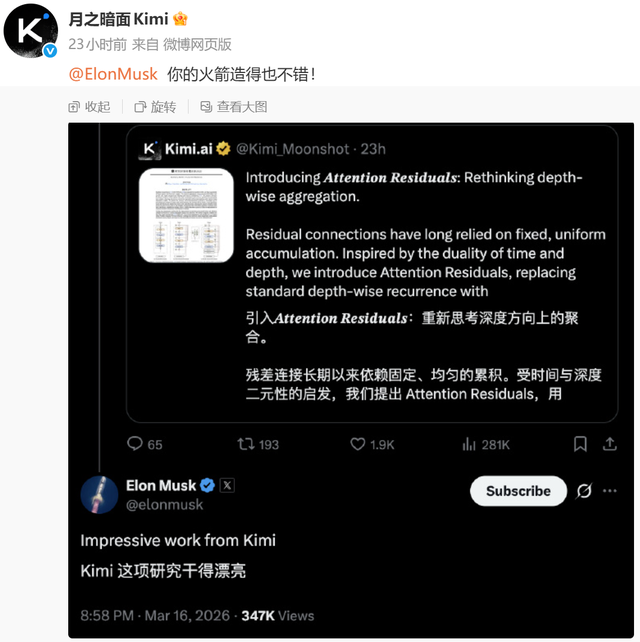 马斯克称赞道:“Kimi的研究令人印象深刻(Impressive work from Kimi)”。随后,Kimi进行了回应:“你的火箭造得也不错!”
