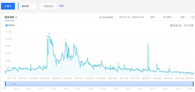 通过百度指数可以看到,近几年“麻辣烫”的搜索热度,显著低于此前。近15年时间里,“麻辣烫”的热度经历了高涨到骤冷,热度最高时2014年7月达到11081,2014年到2018年期间,始终保持着较高热度。2020年起,“麻辣烫”热度出现明显降温,此后热度一路下滑,2026年起热度始终保持在1000以下。