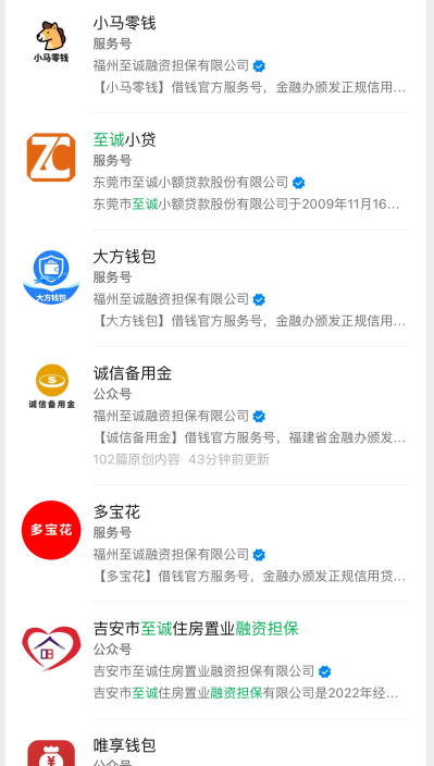 在多项违规叠加的同时,福州至诚融资担保还在通过“马甲矩阵”刻意规避监管。WENONEY研究室核查发现,截至2026年3月15日,该公司在微信公众号上注册的、备注含“借钱”“贷款”字样的服务号超过20余个。业内人士透露,这种多账号模式的核心目的就是分散监管风险——一旦某一产品被查,其他“马甲”可快速补位,大幅增加监管溯源难度。