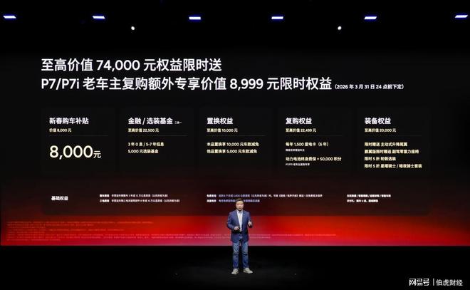 即日起至2026年3月31日24点前下定小鹏P7,用户可享受至高74,000元的配置限时送权益,包括价值8,000元的新春购车补贴,并可二选一享受5,000元选装基金,或3年0息/5-7年低息的金融购车权益;同时,置换用户可获至高10,000元置换权益,复购用户可享至高22,499元复购权益。在外观方面,小鹏提供了至高价值20,000元的装备权益,两款新色套装及轮毂选装的限时半价优惠,主动式升降尾翼限时赠送,购买鹏翼版车型的朋友还可额外获赠副驾零重力座椅。多重礼遇助力用户轻松开启智能出行生活。