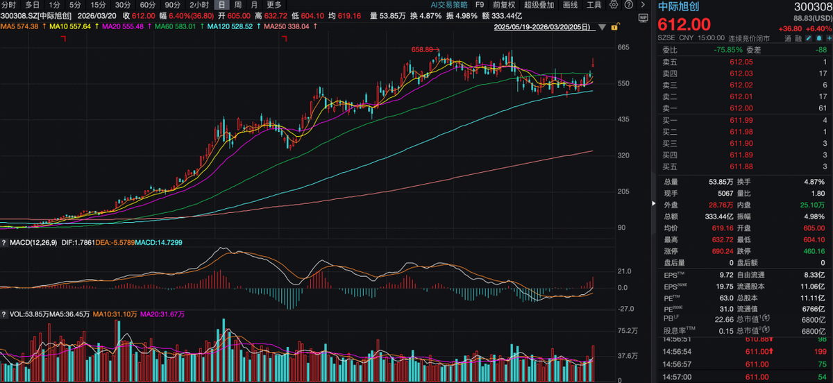 截至3月20日收盘,中际旭创报收于612元/股,当日收涨6.4%,动态滚动PE为63倍,市值为6800亿元。