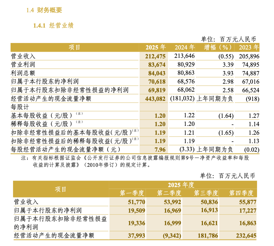 2025年,中信银行实现归属于该行股东的净利润706.18亿元,比上年增长2.98%;营业收入2,124.75亿元,比上年下降0.55%;其中实现利息净收入1,444.69亿元,比上年下降1.51%,实现非利息净收入680.06亿元,比上年增长1.55%。