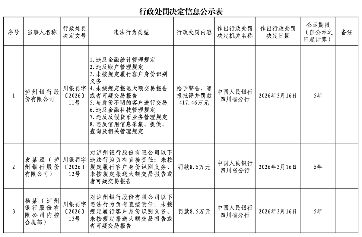 同时,对泸州银行袁某泓,罚款8.5万元;泸州银行内控合规部杨某,罚款8.5万元。泸州银行内控合规部赵某,罚款8.5万元。泸州银行运行管理部应某佳,罚款2万元。泸州银行运行管理部李某靖,罚款2万元。泸州银行运行管理部李某霞,罚款2万元。泸州银行授信审批部宋某,罚款1万元。泸州银行授信审批部刘某汐,罚款1万元。泸州银行古蔺支行胡某 ,被罚款1万元。泸州银行古蔺支行何某,罚款1万元。