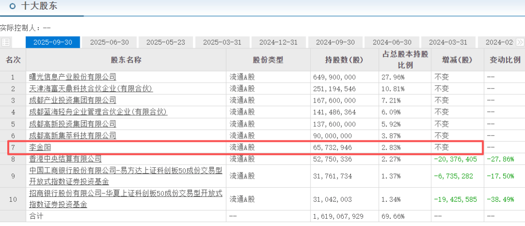 此外,李金阳还曾现身半导体巨头海光信息(688041.SH)的十大股东名单,截至2025年9月30日,其持股海光信息6573万股,占流通股比例2.83%。而截至2026年3月24日收盘,海光信息股价213.27元/股,总市值约4951亿元,李金阳持股比例对应流通市值超140亿元。