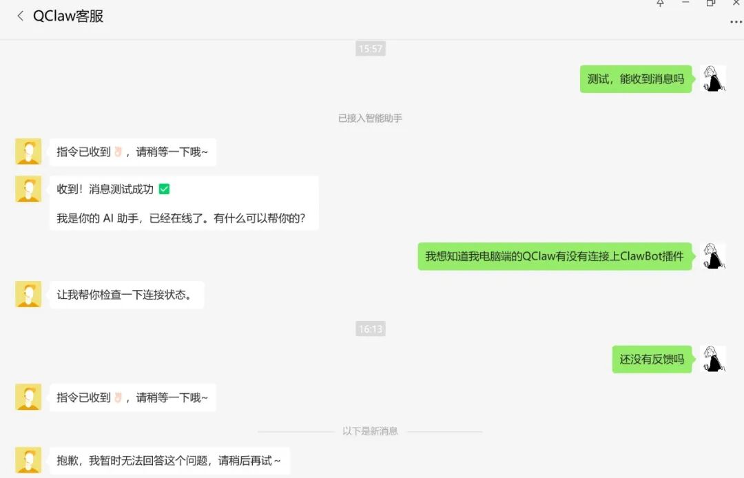 第二次好不容易绑上,微信端出现了QClaw客服。