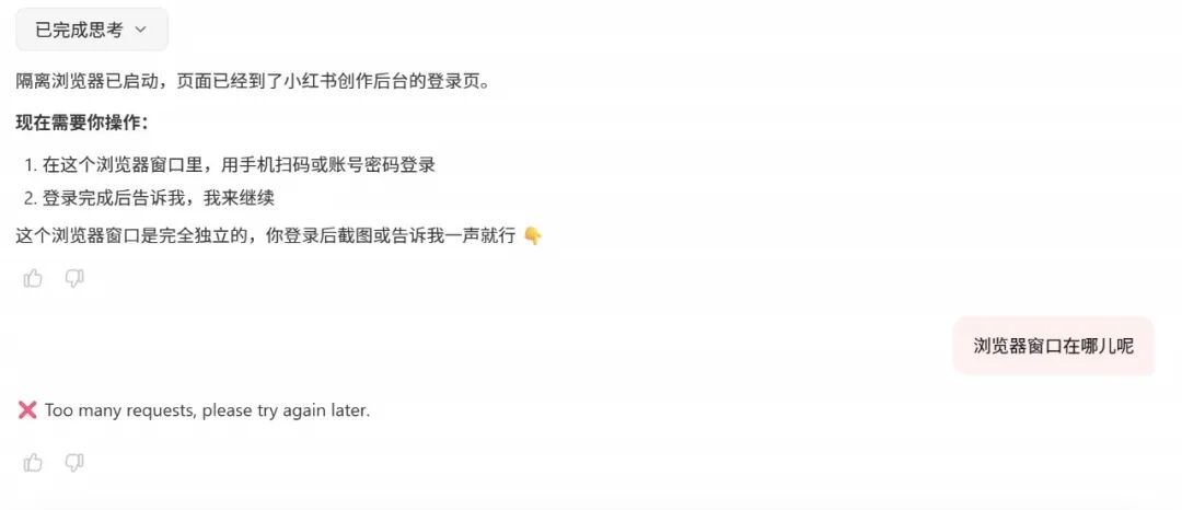 结果浏览器无法直接访问小红书创作后台(需要登录验证),直接给了一版笔记内容。当我再次尝试让它给我一个登录窗口时,任务直接卡住了。