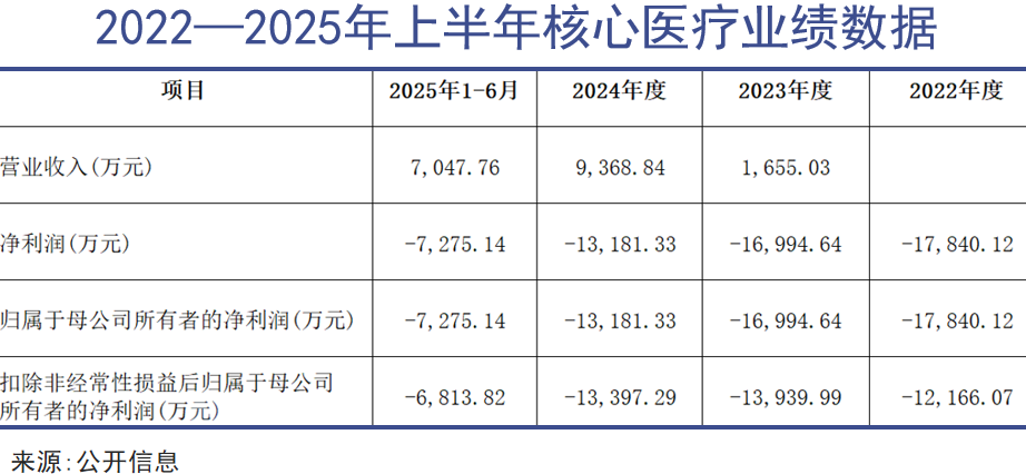 核心医疗的营收增长也较为迅速,但亏损情况同样不容乐观。招股书显示,2022年至2025年上半年,其归母净利润分别为-1.78亿元、-1.70亿元、-1.32亿元、-0.73亿元,累计亏损约5.53亿元。