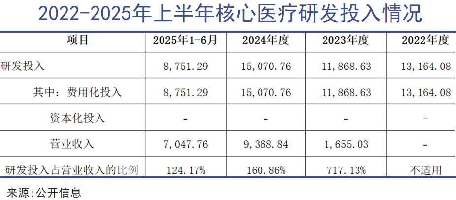 其次,持续高企的成本支出,是导致两家公司持续亏损的核心原因。人工心脏属于技术密集型产品,需要持续投入大量的资金用于技术研发、临床试验和产品迭代。2022年至2025年上半年,同心医疗的研发费用分别为9381.86万元、1.08亿元、1.48亿元和9315.39万元;核心医疗的研发投入同样不菲,研发投入占营业收入比例长期在100%以上。