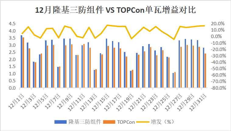 而隆基单面组件,凭借HPBC 2.0技术的正面弱光响应能力,在光照最差的12月跑出了9.4%的超发率。拆解到每一天,超发率在多个关键日期达到两位数,最高逼近17%。这意味着在整个12月的绝大多数日子里,隆基三防组件都保持着对竞品组件的明显优势。