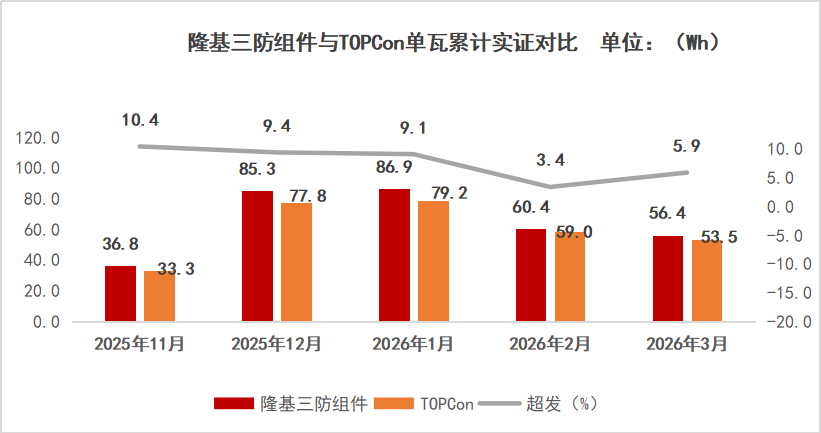 从整体发电数据来看,隆基三防组件在整个测试周期内始终保持稳定领先。11月,隆基超发10.4%;12月,超发9.4%;1月,超发9.1%;2月,超发3.4%;3月,超发5.9%。