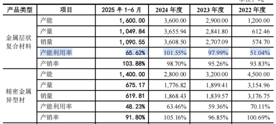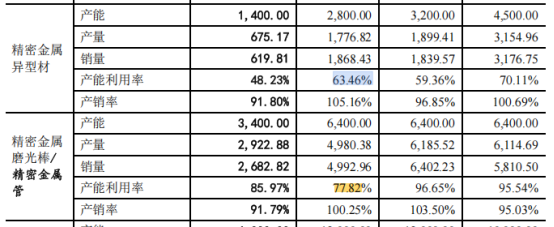但现有产品产能利用率参差不齐:精密金属异型材常年不足七成,精密金属磨光棒从96.65%降至77.82%,核心钛-铝复合材料已跌至65.62%。