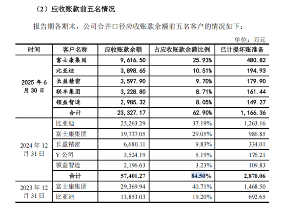 2024年末,前五名客户应收账款占比高达84.50%,其中比亚迪单一客户占比37.19%。