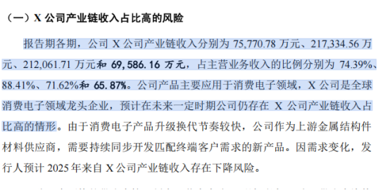 2022年至2024年,公司来自X公司产业链的收入分别为7.58亿元、21.73亿元、21.21亿元,占主营业务收入的比例高达74.39%、88.41%、71.62%。即便在2025年上半年,这一比例仍达65.87%。这种深度绑定、本质上也是一把双刃剑。