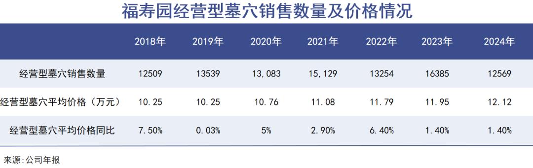 从2017年之后,福寿园就再没公布各个产品类型的单价,而是统归为经营型墓穴,但仍旧是涨势不断。到2024年,福寿园单个墓穴的平均价格已经超过12万元。