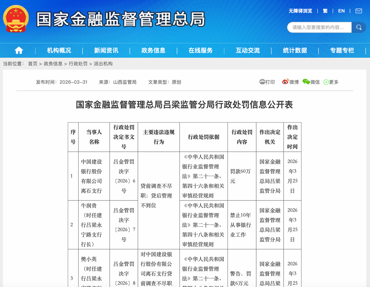 3月31日,国家金融监督管理总局吕梁监管分局行政处罚信息公开表显示,中国建设银行离石支行,因贷前调查不尽职;贷后管理不到位,被罚款60万元。时任建行吕梁永宁路支行行长牛润贵,被禁止10年从事银行业工作。时任建行吕梁永宁路支行行长樊小英,被警告,罚款6万元。时任建行吕梁永宁路支行客户经理李金平,被警告。