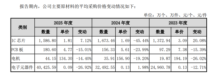 电子元器件采购占比约20%,供应商较为分散,报告期内采购均价波动较大,2025年采购价格下降26.92%;主要IC芯片均通过贸易商采购,采购价格持续下滑,2024年采购均价同比下滑45.44%。北交所对此的质疑直指核心:定价公允性如何?是否存在利益输送?