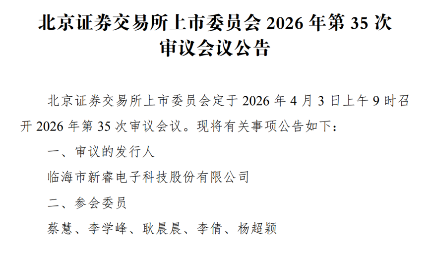 中国产经观察消息:2026年4月3日,临海市新睿电子科技股份有限公司(以下简称“新睿电子”)即将迎来北交所上市委的审核。然而,在看似充满希望的上市征程背后,新睿电子却隐藏着诸多负面因素,从业绩表现到公司治理,从财务状况到法律风险,每一个环节都似乎在警示着投资者:这家公司的上市之路可能布满荆棘。