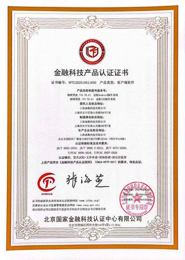 近日,榕树贷款凭借在数智金融领域的技术创新实力、合规建设与行业影响力,再获“金融科技产品认证证书”。这一认证不仅标致着榕树贷款在系统安全、数据合规与隐私保护等关键能力方面获得官方权威认可,也进一步凸显了其以技术驱动数智金融高质量发展的综合实力与行业示范价值。