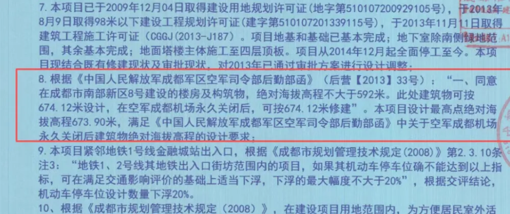 成都房产大V认为,不是金融城8号不想整栋取证,而是根本取不了,若未经军方批准,在98米以上高度进行建设,将违反《军事设施保护法》相关规定,面临拆除超高部分等行政处罚。