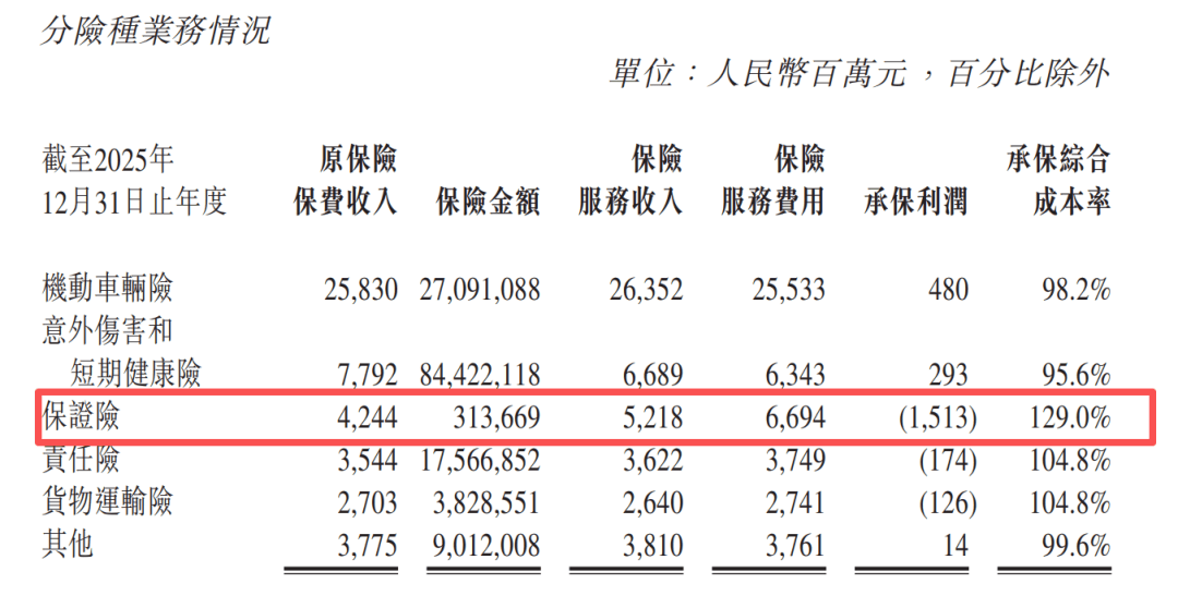 阳光保险在年报中称,为适应市场环境变化和宏观政策调控要求,公司决定自2026年起停止新增融资类保证险业务。考虑到融资类保证险的业务特性,公司基于审慎性原则计提了准备金造成其2025年承保综合成本率129.0%。