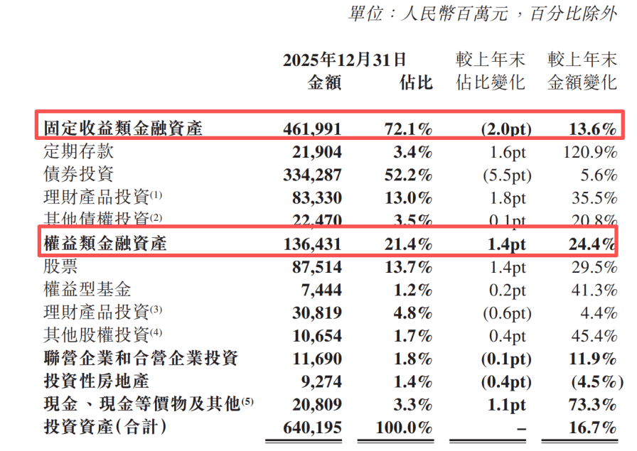 具体来看,固定收益类金融资产实现4619.91亿元,同比增长13.6%,占比72.1%;权益类金融资产实现1364.31亿元,同比增长24.4%,占比21.4%;联营企业和合营企业投资实现116.90亿元,同比上升11.9%,占比1.8%。