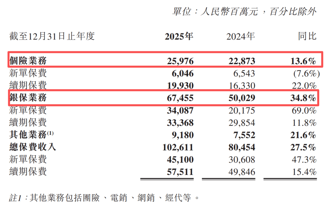 个险渠道仍在转型中。2025年,个险实现总保费收入259.8亿元,同比增长13.6%;个险新业务价值实现18.5%的正增长。
