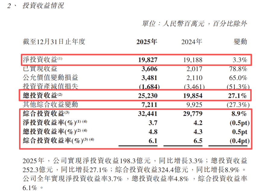 年报显示,阳光保险总投资资产规模为6402.0亿元,较上年末增长16.7%。实现总投资收益252.3亿元,同比增长27.1%;综合投资收益324.4亿元,同比增长8.9%;净投资收益实现198.3亿元,同比增长3.3%。