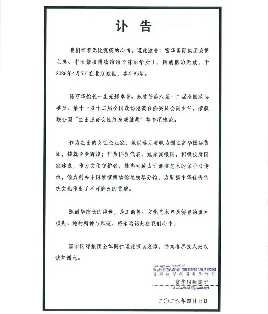 来源 | 凤凰网风财讯 4月7日,富华国际集团官网挂出讣告宣布“集团荣誉主席、中国紫檀博物馆馆长陈丽华女士,因病医治无效,于4月5日在北京逝世,享年85岁。”