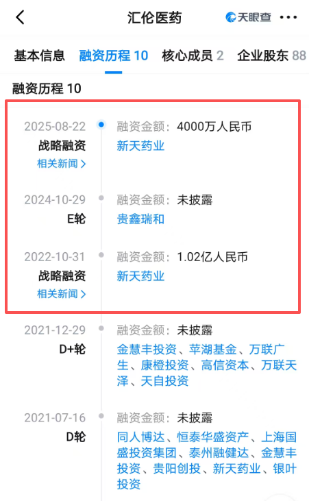 更值得关注的是,融资结构或发生了根本性变化。天眼查显示,汇伦医药2022年以来的三轮融资中,外部机构参与程度大幅减弱,实控人董大伦旗下的新天药业成为核心增资方,公司融资从“机构抢投”转向“自己人力挺”。