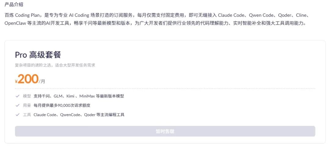 涨价前7.9元/首月的特惠套餐已全面下架,200元/月的Pro套餐也显示无货。