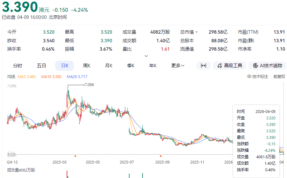 截至4月9日收盘,中国飞鹤港股报价3.39港元/股,是2025年以来新低,相较2021年高位约24.06港元/股,累计跌幅约86%,总市值更是跌破300亿,仅约298.6亿港元。